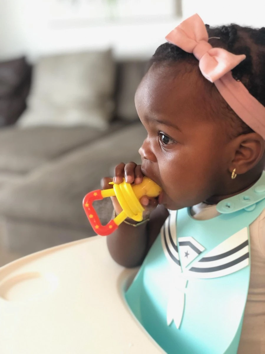 – Je gebruikt de speen voor stukjes groenten en fruit, onmisbaar bij het voedselavontuur dat je aangaat met je baby.