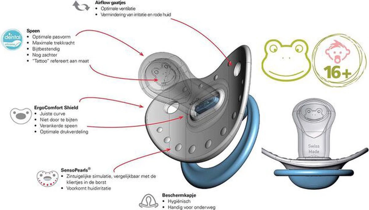 - ErgoComfort Shield: De juiste curve, niet door te bijten, een verankerde speen en een optimale drukverdeling.