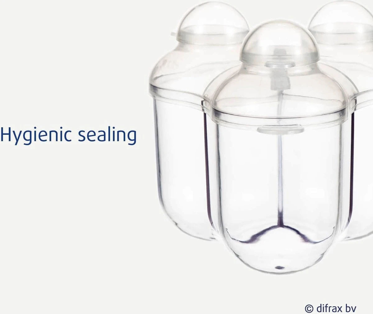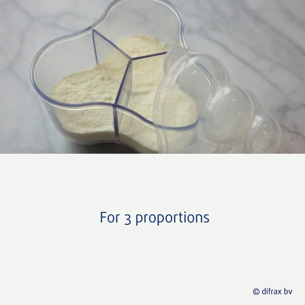 In het Difrax drievaks melkpoeder doosje kun je drie flesvoedingen hygiënisch meenemen, zoals melkpoeder of babyvoeding. Vul de S-fles of andere babyfles makkelijk onderweg. In elk vakje past een voeding van 210 ml (7 schepjes poedermelk).