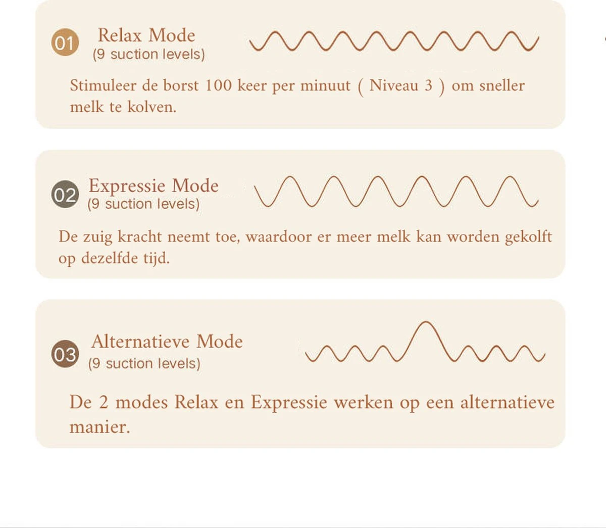Deze borstkolf is voorzien van 9 instelbare zuigsterktes, waardoor je de perfecte sterkte kunt kiezen voor jouw comfort tijdens het kolven. Hierdoor is er altijd een instelling die aangenaam aanvoelt en waarmee je rustig en op je gemak kunt kolven. Deze flexibiliteit in zuigsterkte zorgt ervoor dat de borstkolf aanpast aan jouw behoeftes en zorgt voor een comfortabele en efficiënte kolfervaring.