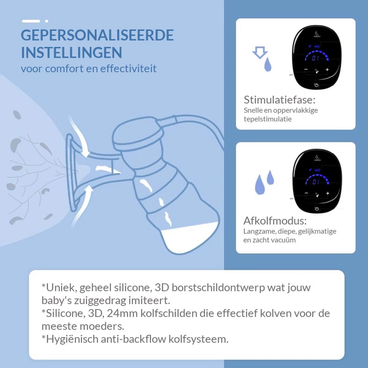 Als enige op de markt maakt Horigen 3D compressie kolfsets; op een zachte manier geven de afkolfschilden massage en druk zodat er effectief melk gekolfd wordt.