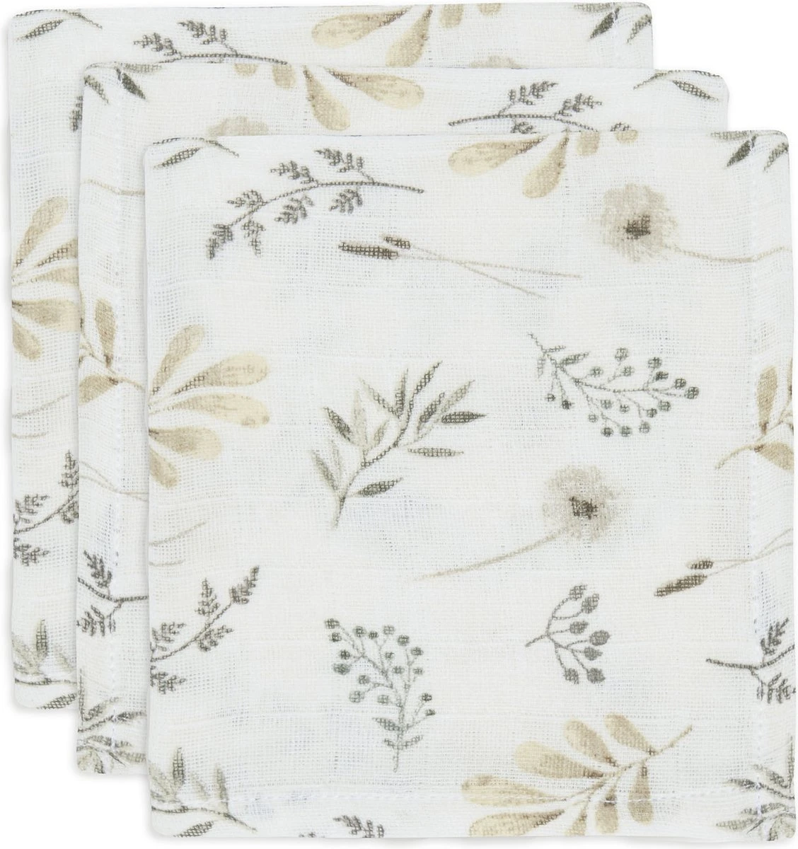 De monddoekjes worden geleverd in een 3-pack. Ze hebben een lief droogbloemen printje op een witte ondergrond. De doekjes kun je lekker heet uitwassen zodat ze altijd weer hygiënisch te gebruiken zijn. Je mag ze wel strijken maar slim om dat juist niet te doen. Ongestreken hydrofiel doeken nemen meer vocht op.