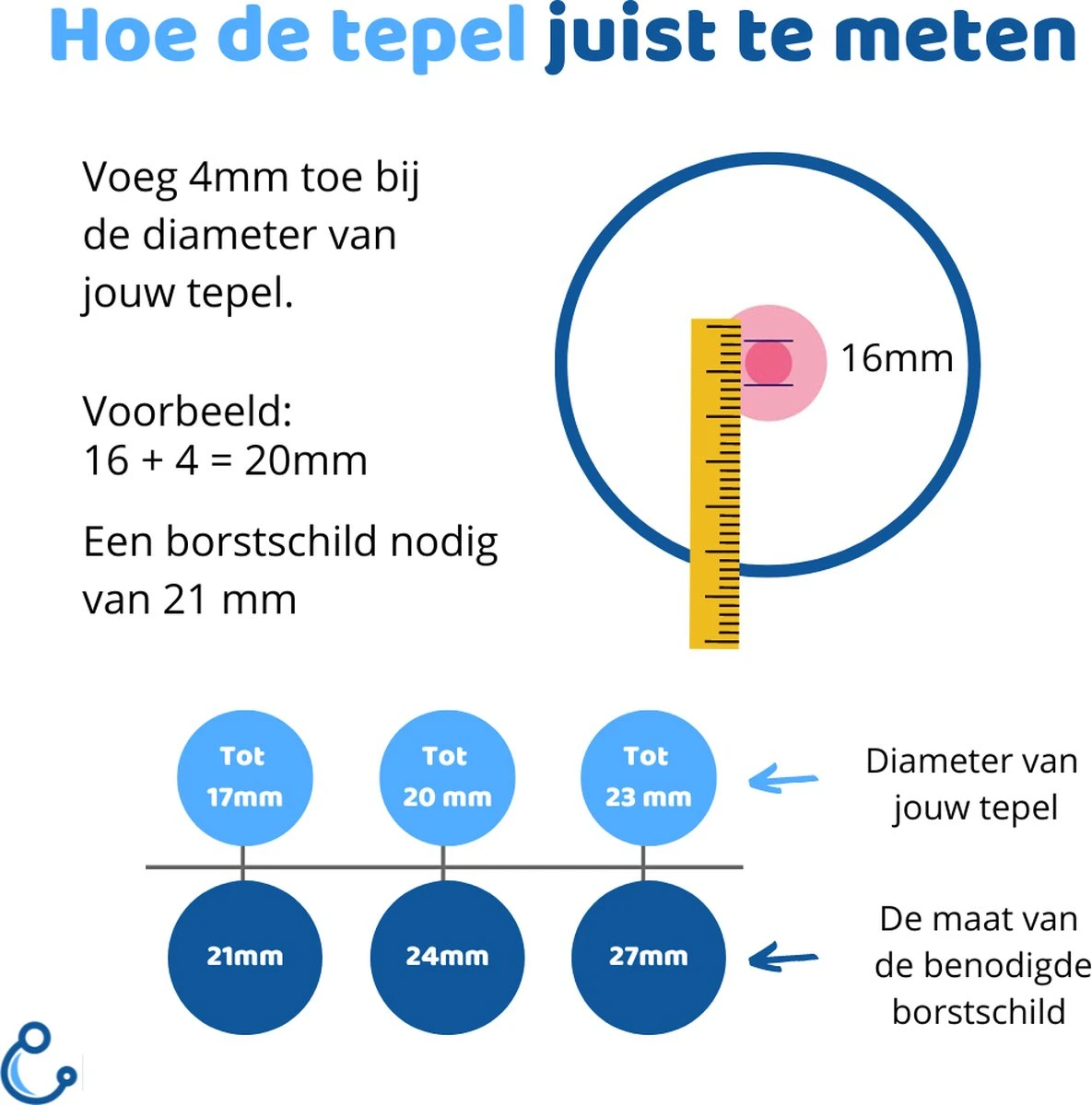 Bij aankoop ontvang je meerdere maten, namelijk de 21mm (inzetstuk), 24mm & 27mm. Zo kan je zelf nagaan welke maat het beste bij je past en hoef je je geen zorgen te maken of deze kolf wel de juiste maat voor jou heeft. Maar hoe weet je zeker welke maat de juiste is? In Nederland is 24 mm de standaard maat. Om de juiste maat van de borstschild te achterhalen is het meten van jouw tepel verstandig. Meet de diameter/doorsnede van jouw tepel (niet het tepelhof). Tel bij de uitkomst een extra 4 mm. De tepel zal tijdens het kolven namelijk nog wat opzwellen.