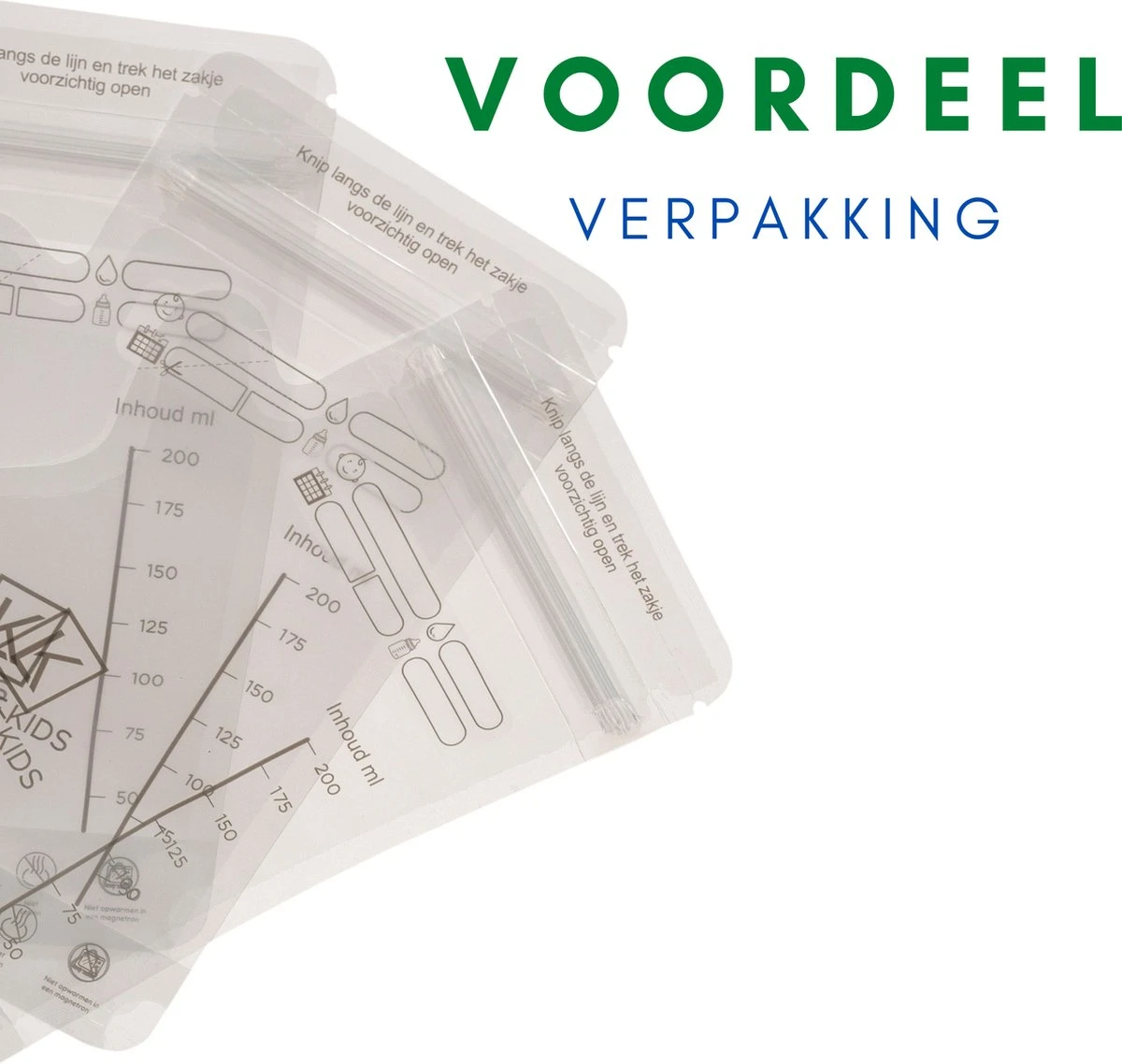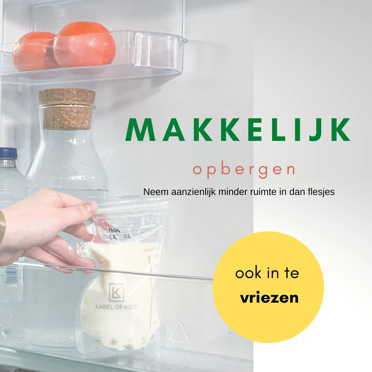 ✓ Ruimtebesparend ontwerp – De Label of Kids bewaarzakjes nemen een stuk minder ruimte in in je koelkast dan flesjes. De onderkant is uit te vouwen zodat ze goed blijven staan, maar opgevouwen nemen ze nog minder ruimte in.