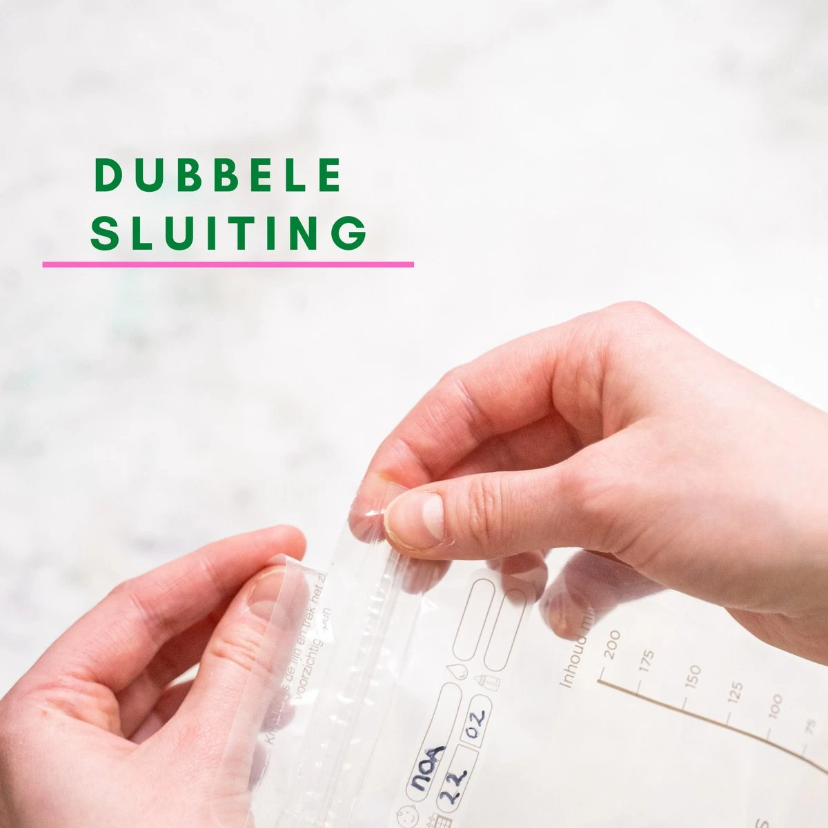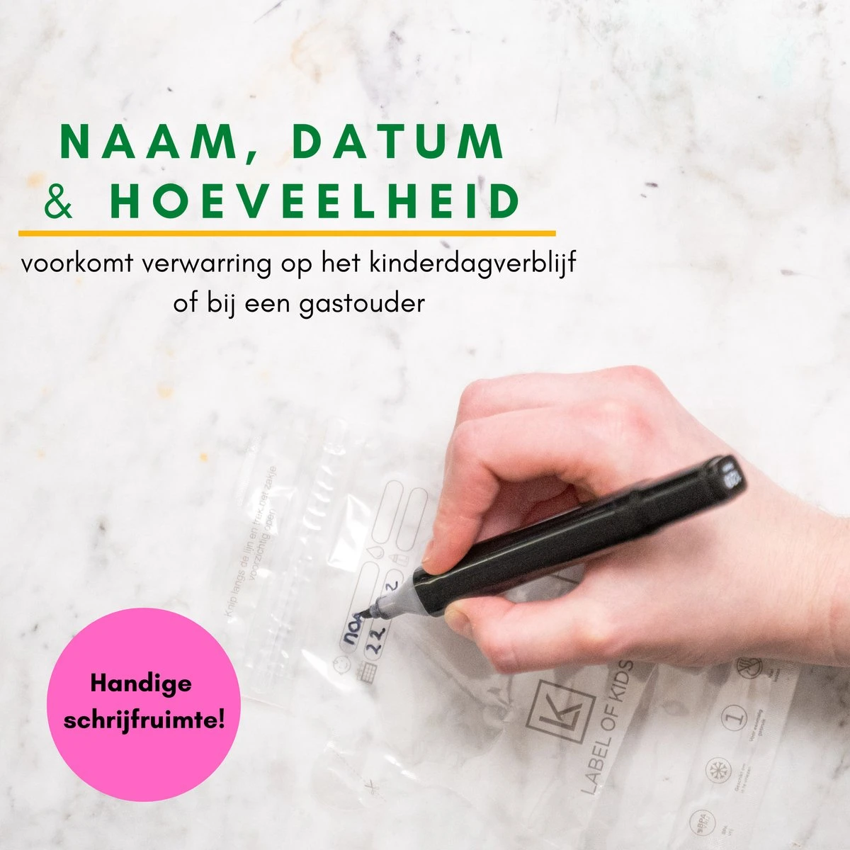 ✓ Zorgvuldig bewaren – Dankzij genoeg schrijfruimte hou je belangrijke informatie, zoals naam, datum en hoeveelheid, bij. En met behulp van de maatstrepen lees je af hoeveel melk er in het zakje zit. Liever de exacte hoeveelheid weten? Meet de melk dan even af voor je het in het zakje doet.