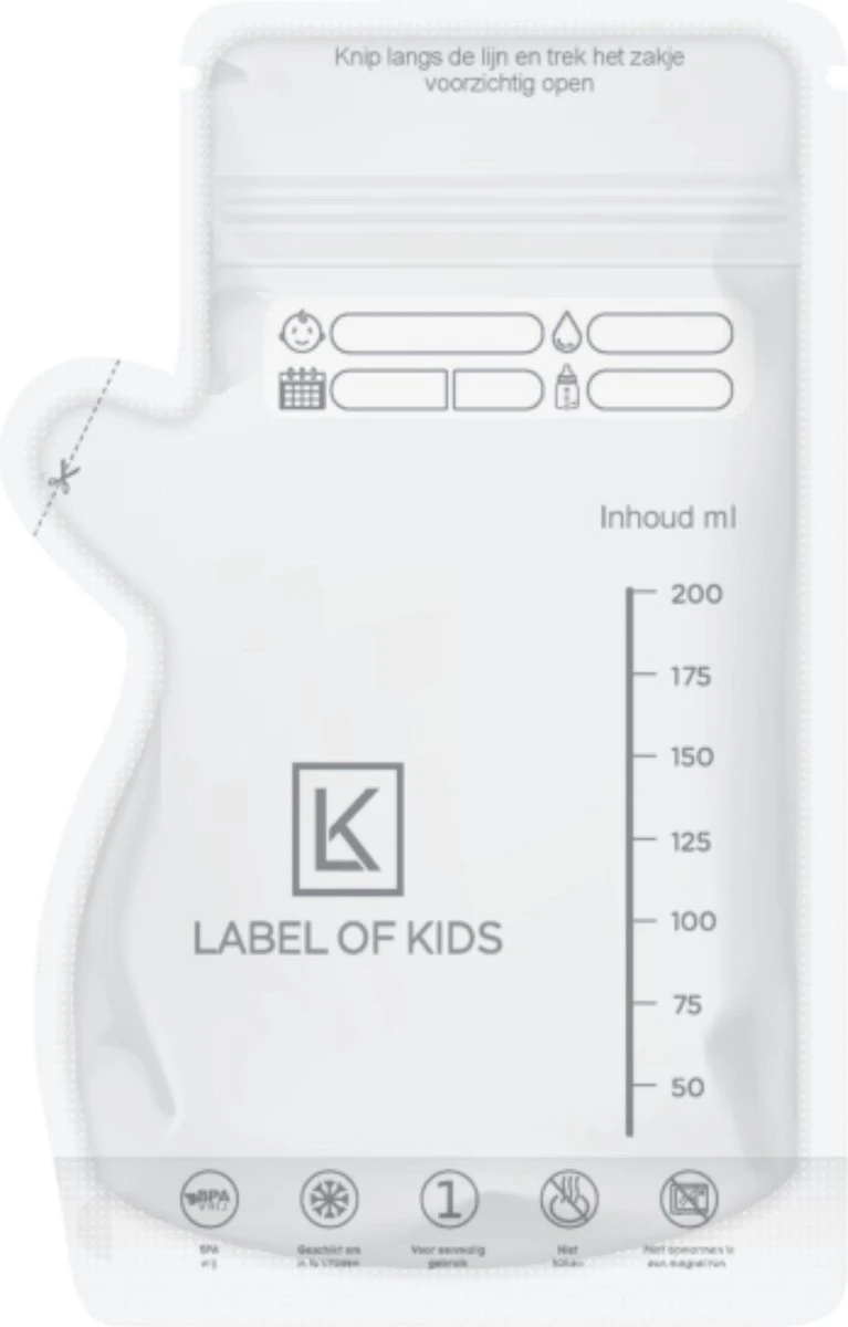 De Label of Kids Moedermelk bewaarzakjes zijn met zorg gesteriliseerd, hebben een dubbele sluiting en zijn volledig BPA vrij. Zo blijft afgekolfde melk lang houdbaar en geheel vrij van bacteriën. Neem een zakje uit de koelkast of vriezer, warm het zakje op in warm water (max. 37 ℃) en de melk is direct klaar voor gebruik!