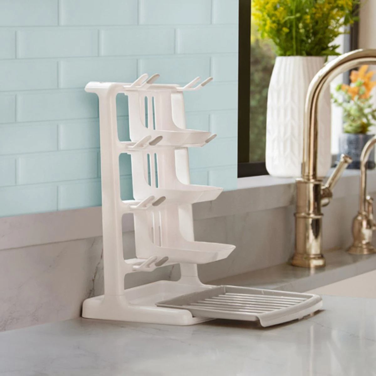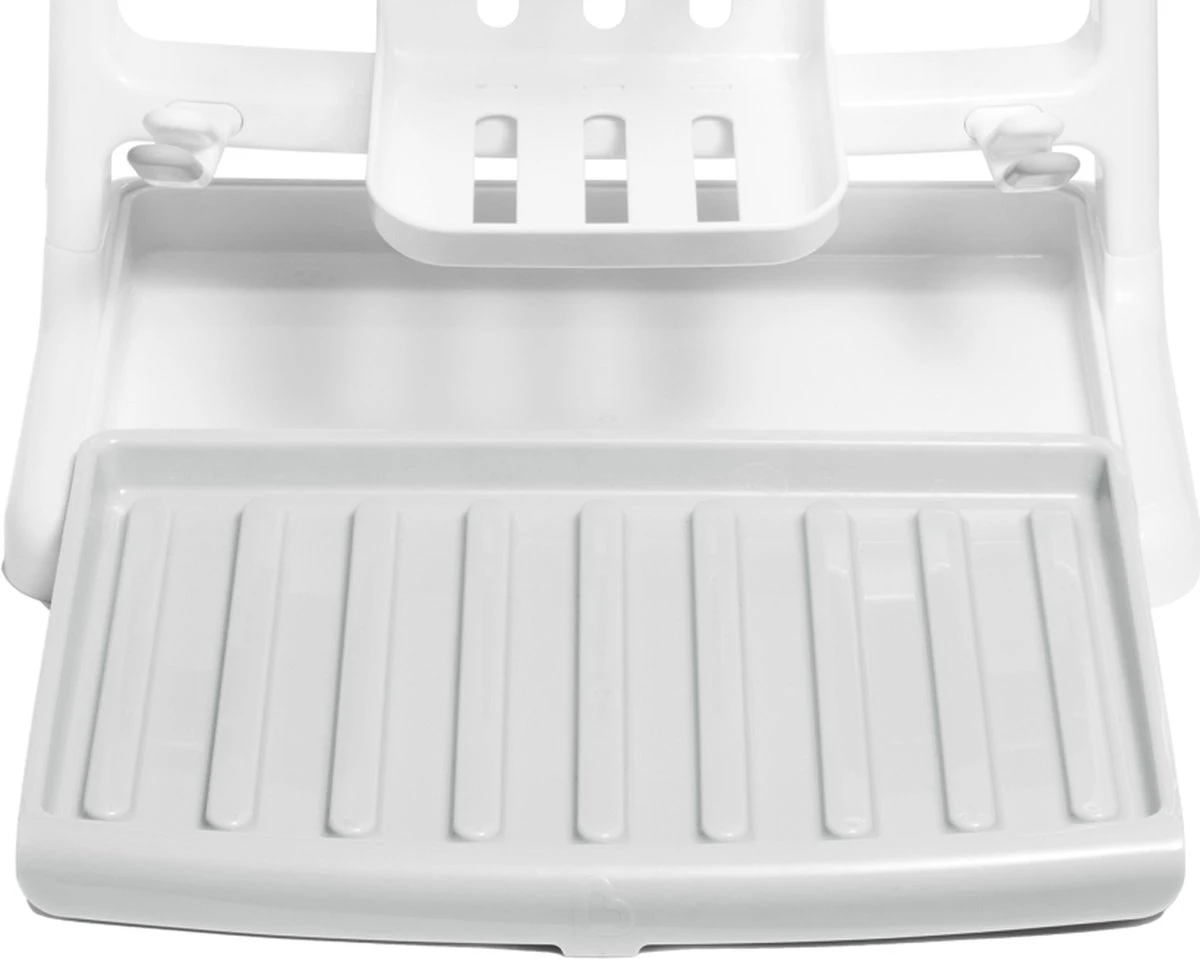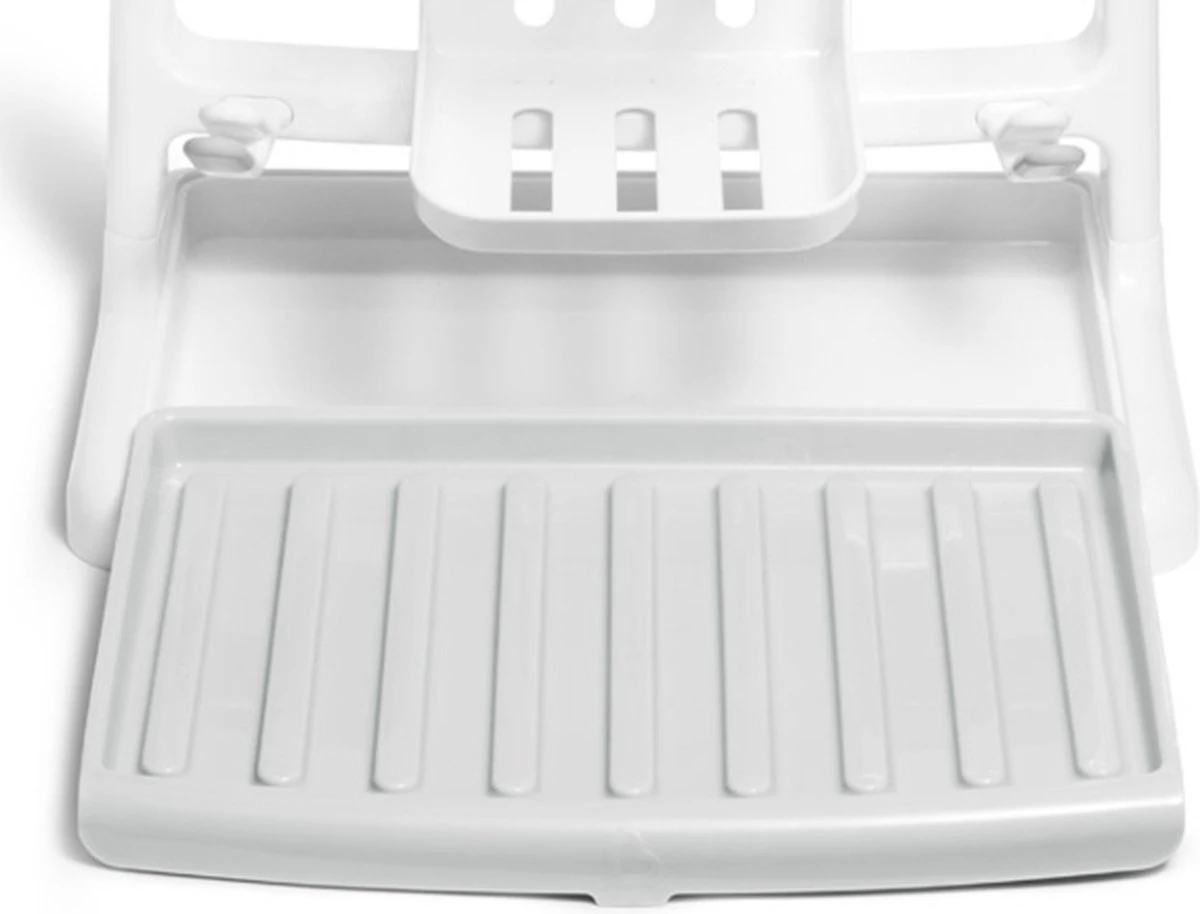 Het verticale design zorgt voor een goede luchtstroomventilatie tijdens het drogen. Het overtollige water wordt opgevangen in het ingebouwde reservoir die uitschuifbaar is, zodat het aanrecht droog blijft.