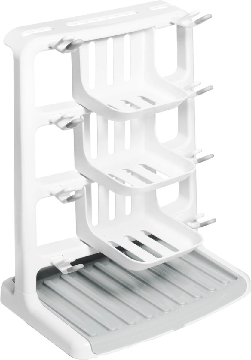 Dit droogrekje heeft afdruiptuiten met een inschuifsysteem en droogmandjes geschikt voor alle formaten flesjes en accessoires. Daarnaast hebben de afdruiptuiten zachte punten om krassen te voorkomen.