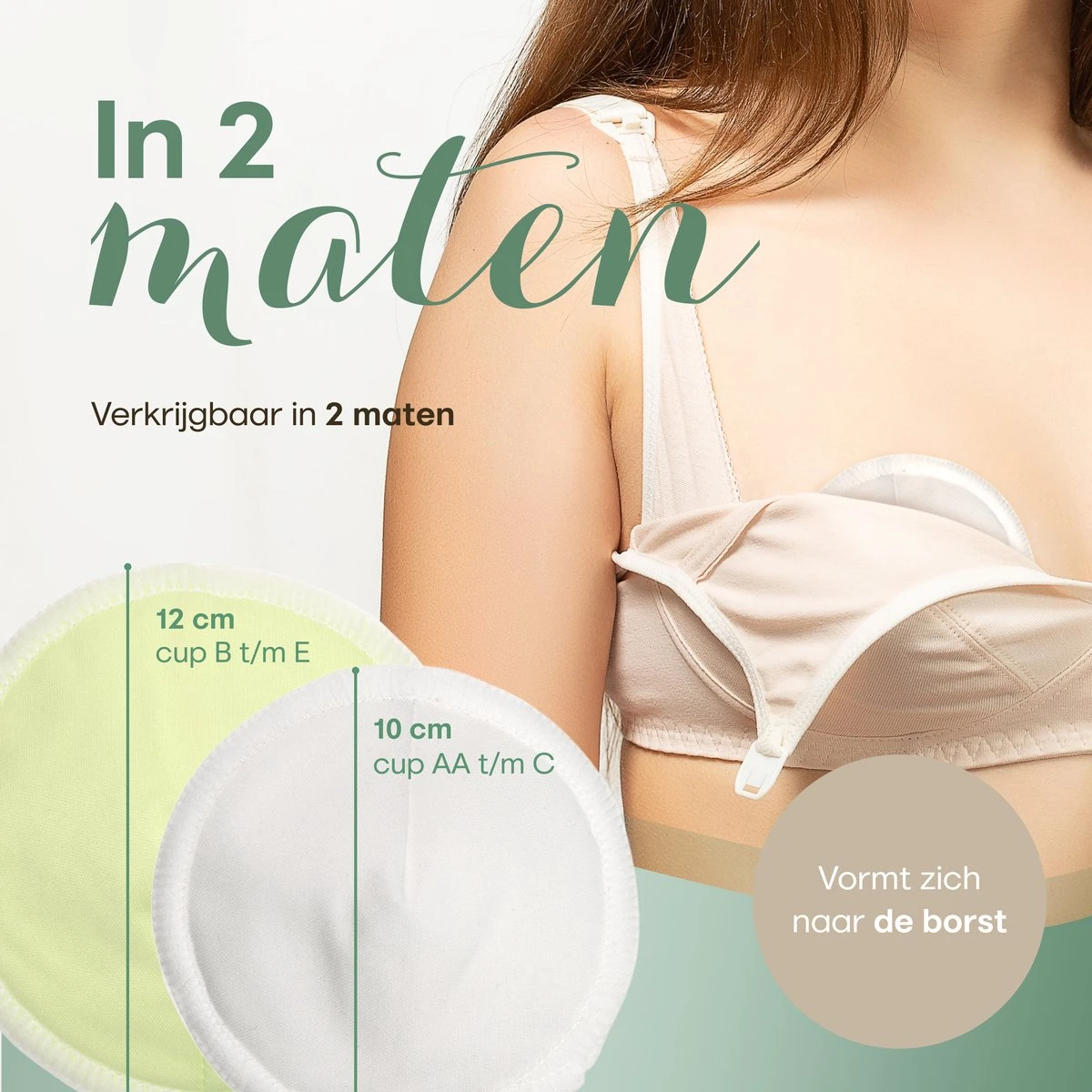 Ieder lijf is anders, maar allen verdienen comfort! Daarom komt de set van 16 zoogcompressen in 2 universele maten die zich naar het lichaam vormen. Deze set heeft een diameter van 10 cm en is geschikt voor cup A tot en met C.