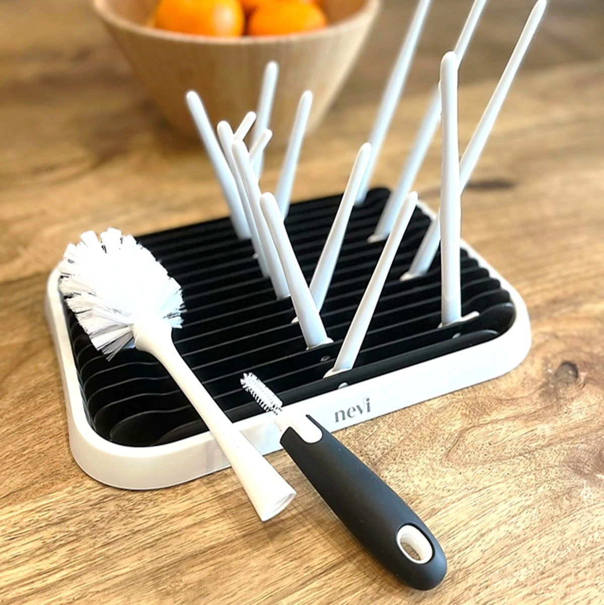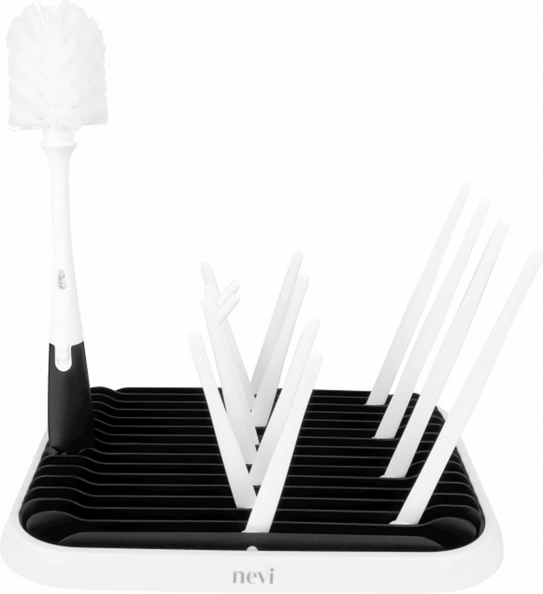 Dit Nevi afdruiprek voor flessen zorgt ervoor dat je gemakkelijk en snel alle vieze babyflessen kunt afwassen en laten drogen op een hygiënische manier. Het droogrek inclusief borstel heeft ruimte voor 10 flessen of andere artikelen zoals een bidon of speen. Het afdruiprek heeft een vrije luchtstroom dankzij het open ontwerp. Ook het reinigen van het flessen droogrek gaat snel, je hoeft alleen maar de afdruipmat af te nemen en te laten drogen. Het afdruiprek met lekbak is makkelijk op te bergen dankzij het opvouwmechanisme.