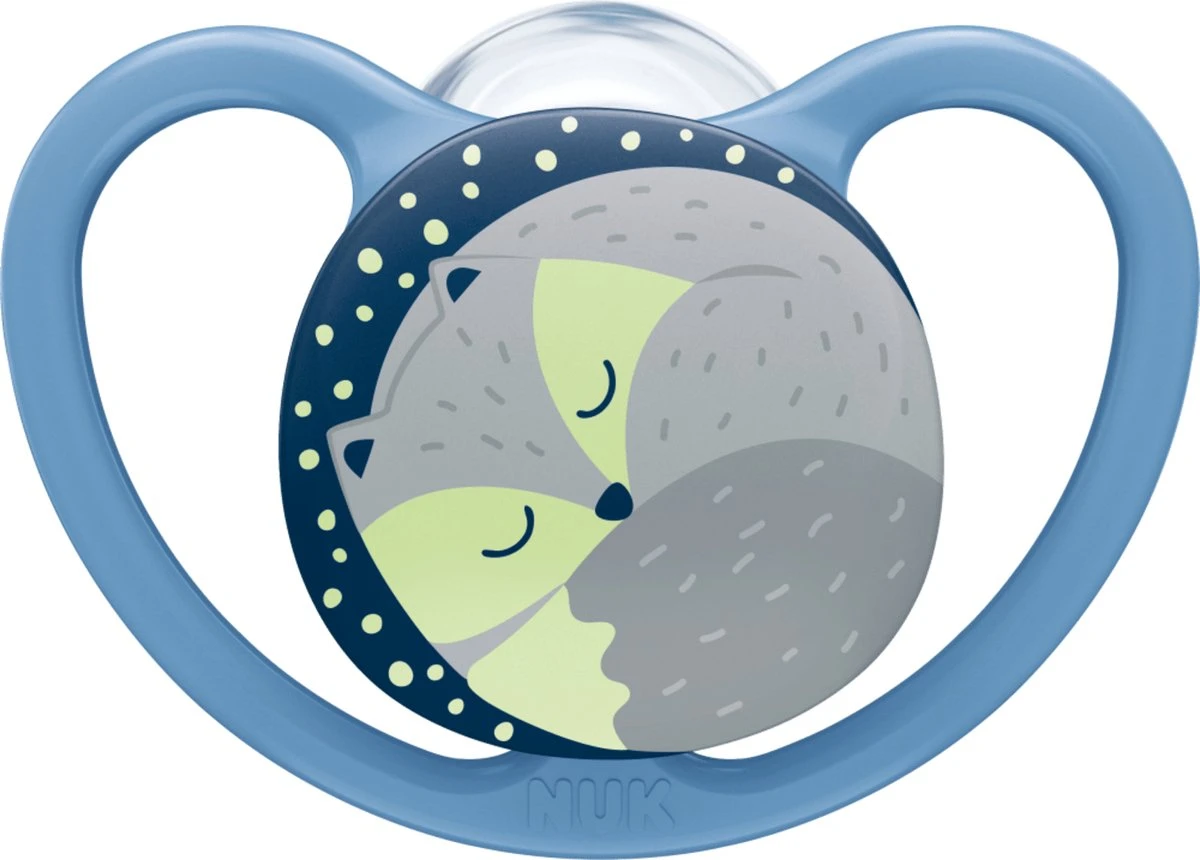 NUK Space Night is een fopspeen die oplicht in het donker. Veilig, lichtgevend materiaal straalt een zacht licht uit dat de baby kalmeert en de baby in staat stelt de fopspeen indien nodig snel te vinden. De ergonomische vorm van de speen is aangepast aan de mond van een klein kind en grote ventilatieopeningen zorgen voor luchtcirculatie.