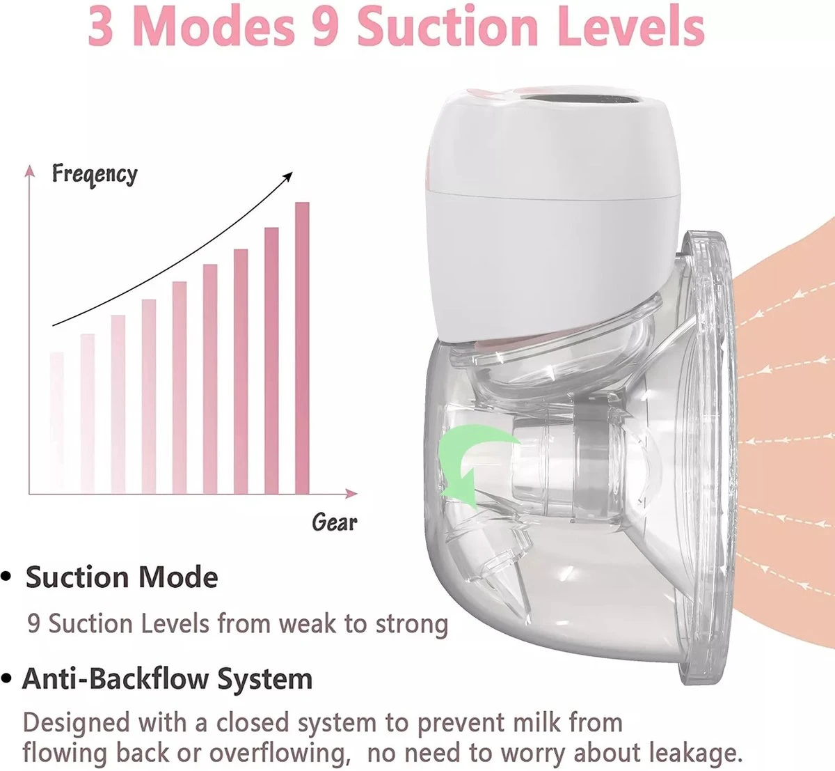 Borstkolf mode: De kolfstand is de meest effectieve manier om moedermelk uit de borst te halen. Door de regelmatige kolfbewegingen komt via deze modus de meeste moedermelk uit de borst. In de borstkolfstand is het ook de handigste manier om moedermelk in het membraan over te brengen.